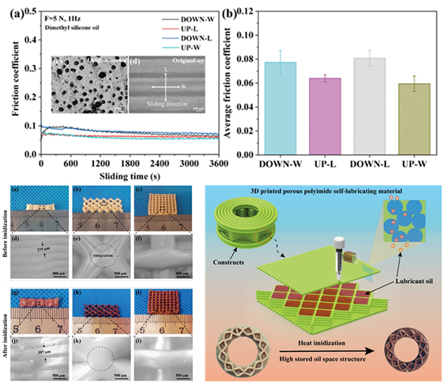 在UV-DIW 3D打印聚酰亚胺研究的基础上,研究人员实现了具有高储油空间结构的多孔聚酰亚胺自润滑材料3D打印制造(图3),得到了内部孔隙可调节、机械性能和热稳定性良好、含油摩擦系数低至0.08的多孔聚酰亚胺制件。研究结果发表在Tribology International和《摩擦学学报》上(Tribology International, 2021, 160:107009;摩擦学学报,https://doi.org/10.16078/j.tribology.2021095),并获2件中国发明专利授权(ZL 202010004572.2和ZL 202010304000.6)。