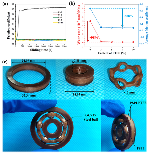 研究人员在系统探究光固化3D打印成形方式对聚酰亚胺摩擦学性能影响的基础上(摩擦学学报,https://doi.org/10.16078/j.tribology.2021115),采用聚四氟乙烯(PTFE)微粉复合,实现了具有优异减摩抗磨性能的3D打印聚酰亚胺自润滑复合材料(图2),并发挥3D打印层层累积成形的优势,实现了“按需润滑”聚酰亚胺自润滑表界面材料和轴承等零部件(图2)的3D打印制造,为复杂结构聚合物自润滑零部件设计与制造提供了材料和技术方案(Tribology International, 2022, 167, 107405)。