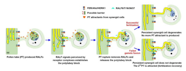 基于其实验结果,瞿礼嘉教授团队提出了防止多根花粉管穿出的屏障建立和解除的工作模型:1)一根花粉管响应临近胚珠发出的吸引信号,穿出花柱道,靶向胚珠。2)花粉管分泌的五个RALF小肽激活花柱道隔膜表皮细胞的三个受体,建立并维持防止第二根花粉管穿出的屏障。3)花粉管进入胚珠后,爆裂释放精细胞完成受精。随着花粉管破裂,其表面的RALF小肽急剧减少,花柱道隔膜处的屏障信号解除。4)如果配子融合成功,宿存助细胞将降解,助细胞分泌的花粉管吸引信号将被修饰、稀释或降解,这样尽管花柱道隔膜处的屏障消失了,也不会有其他花粉管再穿出花柱道靶向胚珠。5)但是如果受精失败,宿存助细胞不会降解,还会继续分泌花粉管吸引信号,这时由于第一根花粉管破裂而解除了花柱道隔膜处的屏障,第二根花粉管就会穿出花柱道进入胚珠进行第二次受精(受精补偿),而第二根花粉管又会通过这五个RALF小肽和FERONIA/ANJEA/HERK1受体在花柱道隔膜处建立起新的屏障,防止其他花粉管的再次穿出(见下图)。