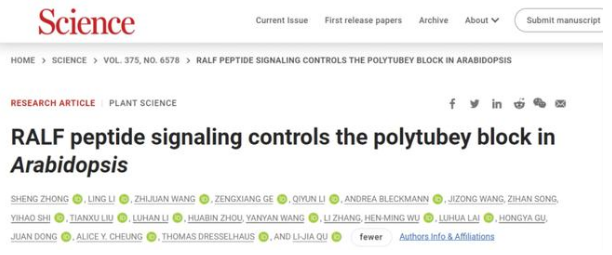2022年1月20日,北大生命科学学院瞿礼嘉教授实验室的研究论文“RALF peptide signaling controls the polytubey block in Arabidopsis”以长文形式在国际著名期刊《科学》(Science)上在线发表,该论文揭示了模式植物拟南芥通过小肽信号及其受体介导的信号通路防止多精受精的分子机制,即每个胚珠仅允许一根花粉管穿出花柱道的隔膜进入其内进行受精。这是瞿礼嘉教授实验室继2017年阐明花粉管爆裂释放精细胞的分子机制(Ge et al., Science 2017)、2019年阐明拟南芥通过种属特异性的花粉管吸引信号实现“同种花粉优先”的分子机制(Zhong et al., Science 2019)之后在植物生殖生物学领域中取得的又一个重要突破。