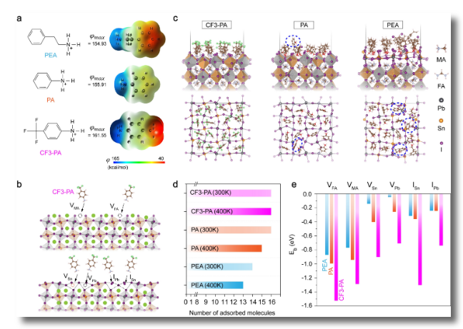 为解决上述瓶颈,本项研究工作提出通过钝化窄带隙钙钛矿晶粒表面缺陷来提升薄膜的载流子扩散长度,从而制备出具有较厚吸光层和更高短路电流密度的电池,以为实现更高效率的叠层电池奠定基础。表界面缺陷钝化是提升钙钛矿电池性能的常用策略,但钝化分子与晶粒表面间的相互作用机制一直尚未明晰;其次,加热结晶过程中,钝化分子表面吸附动力学过程对于表面缺陷钝化效果至关重要,但领域中前期研究对这一关键点尚未引起关注。在本项研究工作中,通过分子动力学模拟研究发现,常用的钝化分子苯乙铵阳离子(PEA)在钙钛矿结晶过程中(温度大约100°C),与钙钛矿晶粒表面的吸附较弱,未能完全钝化表面缺陷位点。而通过结构设计来调控钝化分子的极性,采用铵基端正电性更强的4-三氟甲基苯铵阳离子(CF3-PA)作为窄带隙钙钛矿的钝化分子,就可以有效提升钝化分子在结晶温度下与缺陷位点的吸附能力。DFT计算结果也表明,CF3-PA的极性强于PEA分子,与表面缺陷间具有更强的结合能,能更充分和更有效地钝化表面缺陷(如图1所示)。