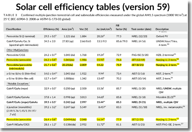 图3. 最新太阳能电池的世界纪录效率表(叠层电池部分)。《Solar cell efficiency tables》是由"太阳能之父"Martin Green教授与美、日、意、澳等多国科学家联合编撰的权威榜单,代表着光伏领域全球最前沿的创新水平。