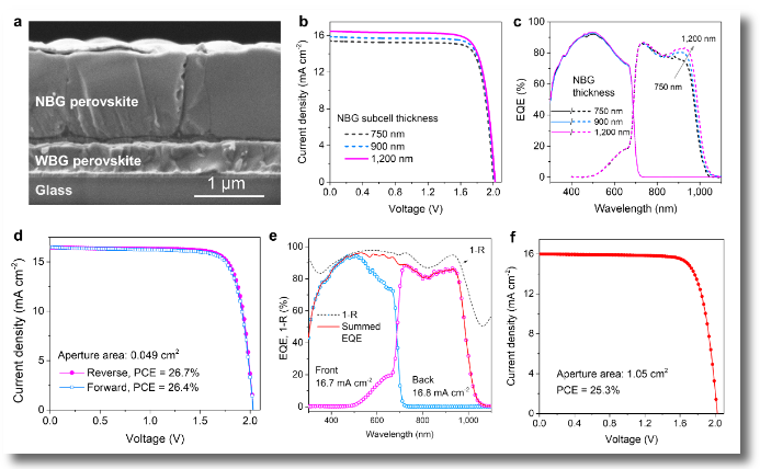 结合以上系列研究思路和器件设计,研究团队通过采用更厚的窄带隙吸光层,成功将全钙钛矿叠层电池的短路电流密度提升到16.5 mA/cm2以上,实现了更高效率的全钙钛矿叠层太阳能电池,实验室自测效率从25.6%提高到26.7%,同时研制出效率高达25.3%的大面积叠层电池(如图2所示)。