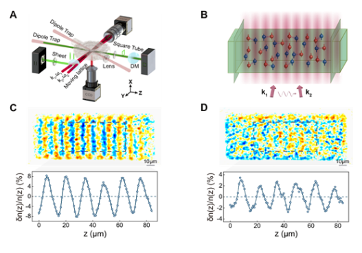 在该项工作中,中国科大研究团队经过4年多的艰苦攻关,搭建了一个全新的超冷锂-镝原子量子模拟平台,融合发展了灰色黏团与算法冷却、盒型光势阱等先进的超冷原子调控技术,最终成功地实现了世界领先的均匀费米气体的制备;与此同时,研究团队还基于低噪声行波光晶格与高分辨原位成像技术,实验实现并理论诠释了低动量传递(约百分之五的费米动量)与高能量分辨率(优于千分之一的费米能)的布拉格谱学方法,并利用其实现了对体系密度响应的高分辨测量。在取得上述两项关键技术突破的基础上,研究团队成功地在幺正费米超流体的密度响应中观测到了第二声的信号(如图1(D)所示),并获得了完整的幺正费米超流体的密度响应谱,实验结果与基于耗散两流体理论的描述高度吻合。
