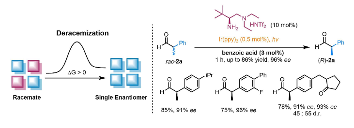 该团队通过系统深入的实验分析和理论计算,厘清了去消旋化的机理,提出了去消旋化手性合成的全新路径(图2):在S-构型手性伯胺催化下,S-醛优先与催化剂形成E-烯胺,随后被光异构化生成Z-烯胺,后者快速水解质子化生成R-醛。构型匹配的S-醛不断被消耗,不匹配的R-醛不断富集,从而实现了去消旋化。在此过程中,光异构化提供了去消旋化反应的驱动力,适当的苯甲酸添加剂调节了达到平衡的速率,伯胺催化剂的立体专一性保证了产物的高对映选择性。