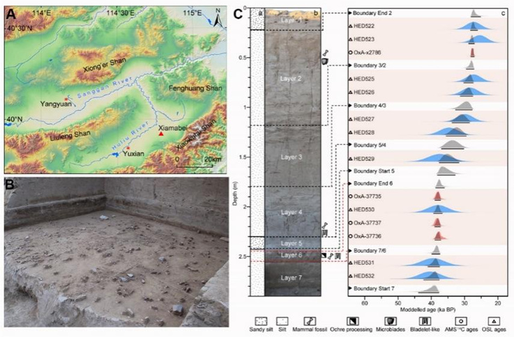被誉为“东方人类故乡”的泥河湾盆地再次为我们带来了突破性认识。在盆地东南缘的下马碑遗址发现了我国乃至东亚地区目前已知最早的史前人类颜料加工与细小石器镶嵌使用的关键证据,生动再现了4万年前东亚人类的生活场景。该遗址由我院于2013年发现并系统发掘。我院与中国科学院古脊椎动物与古人类研究所、中国科学院地质与地球物理研究所、安徽大学、德国马普人类历史科学研究所(MPI)、法国波尔多大学、蔚蓝海岸大学、西班牙加泰罗尼亚古生态与人类演化研究所(IPHES)等国内外多家科研单位开展了综合性、多学科、跨平台的国际合作研究,研究成果于2022年3月2日以Innovative ochre processing and tool use in China 40,000 years ago为题在国际顶级学术期刊Nature正式在线发表。