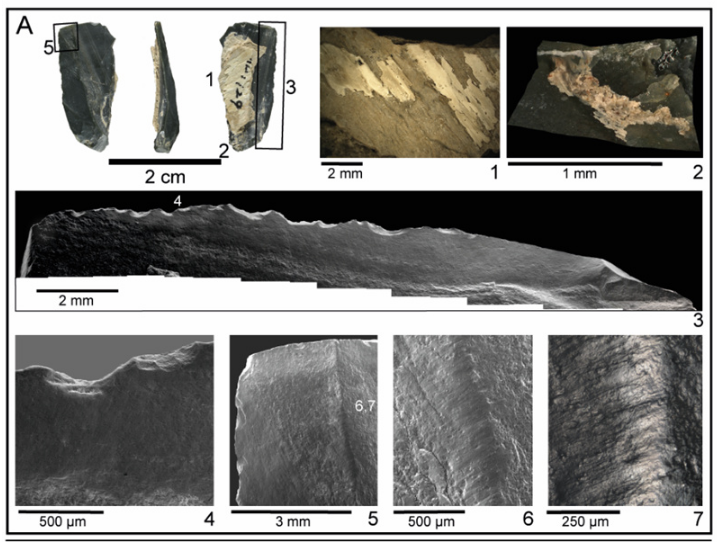 一件似细石叶石器(表面残留部分骨柄) (no. 129)。(1)残留骨柄; (2)残留植物纤维;(3)使用刃的腹面观; (4-7)疑因削木头产生的微痕。(研究团队提供)