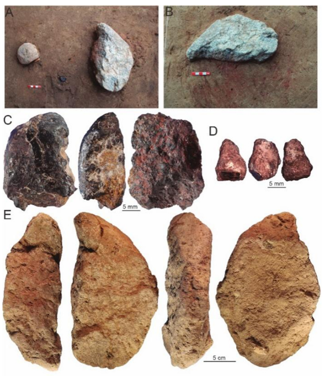 赤铁矿加工相关遗迹(红色染色区)与遗物。A, 相关遗物和遗迹的原始状态;B, 赤铁矿粉末染色区;C, 表面可观察到摩擦痕的赤铁矿;D, 赤铁矿小块;E, 表面染色并残留赤铁矿微屑的加工工具(石灰岩板)。(研究团队提供)