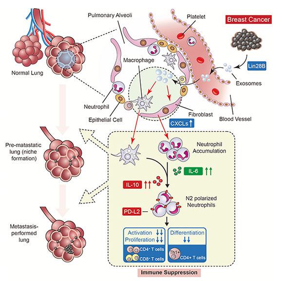 图注:Lin28B通过外泌体调节转移前肺组织免疫抑制促进乳腺癌转移新机制