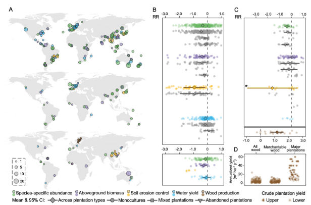 人工林(与天然林相比)在生物多样性与生态系统服务各个维度的评估:A-数据来源分布及数据量;B-人工林与成熟天然林相比的相对成效(上图),林龄较老或处于废弃状态的人工林与天然林相比的相对成效(下图);C-人工林与恢复的天然林相比的相对成效,包括木材生产 (下图);D-恢复的天然林与全球主要单一树种人工林在木材年均产量上的对比(图片来源:文章)