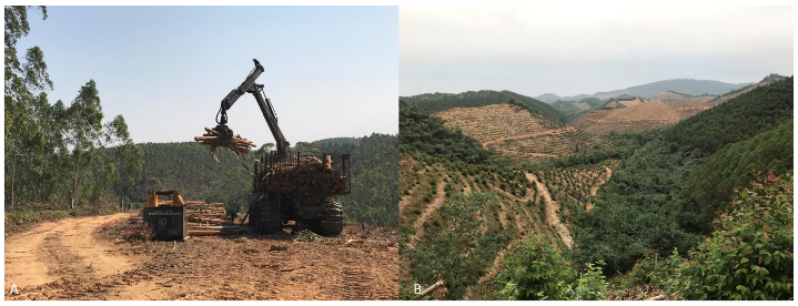 用于木材生产的人工林:A-广西省合浦县的速生丰产桉树人工林;B-广西省高峰林场主要用于木材生产,但也保留有天然林的森林景观(图片来源:华方圆)