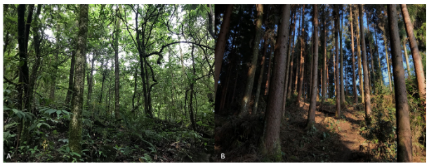 天然林与人工林景观:A-四川省大相岭省级自然保护区中的天然林;B-四川省洪雅县境内的柳杉人工林(图片来源:华方圆)