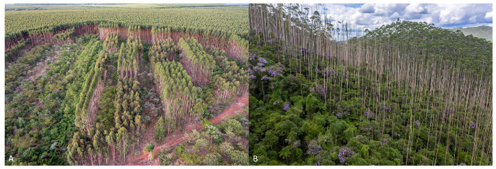 创新性的天然林恢复试点:A-巴西圣保罗州Itatinga圣保罗大学森林实验站的桉树人工林景观中,通过自然恢复、人工辅助的自然恢复、人工种植多样本土植物等方式恢复天然林生态系统;在种植有桉树的实验地,桉树在种植5年后采伐,木材收入可用于帮助承担恢复项目的成本;B-巴西圣保罗州Bertioga对桉树人工林进行改造,用药剂杀死桉树,让本地植物群落自然生长,最终恢复为本地原有的大西洋雨林(图片来源:Paulo Molin和Pedro Brancalion)