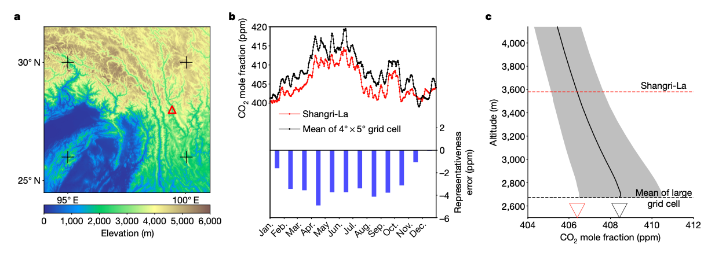 针对这些问题,北京大学城市与环境学院中法地球系统模拟联合研究中心和中国科学院地理科学与资源研究所合作领导的研究团队重新核算了我国的陆地碳汇大小。该研究采用全球二氧化碳反演模型(CAMS)对中国陆地碳汇进行估算,发现修正横向碳通量后,中国2010—2016年平均陆地碳汇的合理反演估计约为9.2亿吨CO2/年;如果在反演过程中包含香格里拉朱张站的CO2浓度观测,则可能得到25.7亿吨碳CO2/年的反演结果。为阐明这一差别的原因,研究团队利用高分辨率大气传输模型对香格里拉朱张站的观测足迹进行了分析模拟。结果表明,先前研究使用香格里拉朱张站观测的CO2浓度作为其所在的粗分辨率大气传输模型网格的平均CO2浓度,使得该区域春季和夏季CO2浓度被显著低估,最终导致粗分辨率的反演模型高估了中国西南地区的碳汇。