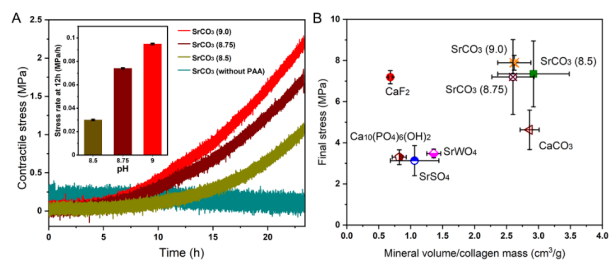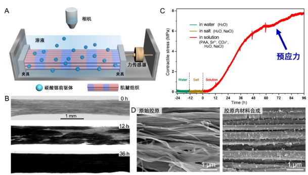 天然骨骼形成是一个典型的生物制造过程。矿化胶原纤维是骨骼的基本构造单元,羟基磷灰石在胶原纤维内部取向合成,形成特殊结构使得骨骼具有优异的力学与功能特性。受骨骼结构形成过程的启发,平航副研究员设计了胶原纤维内限域合成与原位研究实验系统。以具有胶原纤维连续定向排列的肌腱组织为基础,实现了碳酸锶晶体在胶原纤维内部的合成。首次发现和证实合成产物形成兆帕级的收缩应力,制备出预应力复合微管(图1)。采用原位拉曼分析、同步辐射小角X射线散射原位分析、同步辐射广角X射线散射分析等方法,揭示了碳酸锶晶体在胶原纤维限域空间内的结构形成动力学过程和预应力形成的机制(图2)。改变矿化溶液的化学组成和其他条件,可调控预应力的大小和预应力形成的速率(图3)。该研究还表明,不同无机材料在胶原内部的合成,均会产生兆帕级收缩应力。
