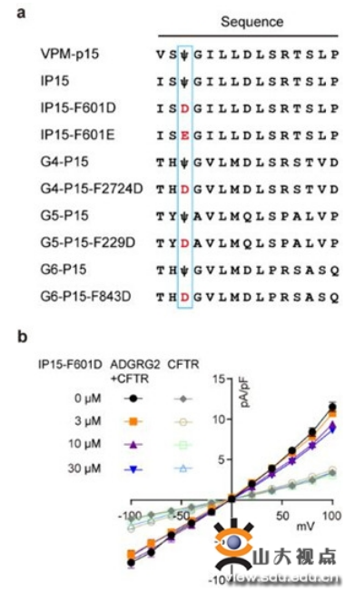a.Stachel肽基激动剂和拮抗剂的序列比对。通过Fss03突变为Dss03或Ess03,用蓝色框标出。Ψ: 4-MeF。b. Stachel肽基拮抗剂F601D和F601E影响ADGRG2介导的CFTR电流响应。