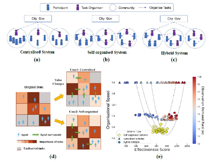 本研究通过基于Agent建模的志愿者系统仿真,对比了三种志愿者组织方案:完全自组织、完全中心化组织、中心化引领与自组织的混合式组织,在不同场景下的组织效率与任务完成效率(图3.a-d)。实验表明,完全自组织方案对多样化环境具有较宽的适应范围,完全中心化组织在已知需求的前提下组织效率最高,而混合式模式兼备高适应性与高组织效率的特点。因此,团队认为应对疫情等突发公共危机时,初期中心自上向下的引领配合自下向上的自组织,可应对快速变化的外部环境,产生最强的组织力。而如何优化志愿者引导机制,科学地将自主发起、自愿参与的力量纳入基层治理是具有重要意义的未来研究方向。