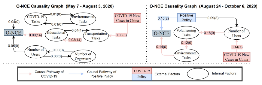 本研究对与自组织效应相关的多种内部因素(例如志愿者人数、任务发布者人数等)和外部因素(例如疫情与抗疫政策、平台机制变化等)进行了基于PCMCI+算法的因果路径分析(图2)。研究表明,每日新增的确诊病例数量通过影响用户数量、任务发布者数量以及任务类型影响了所有志愿者行为的自组织效应。同时,来自政府和平台的正向引导措施对任务参与以及任务类型的自组织效应有很大影响。