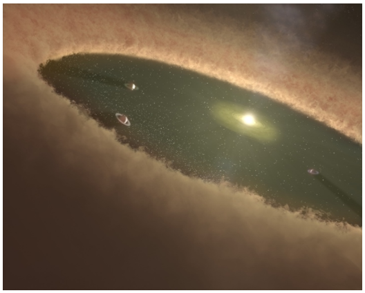 刘倍贝团队提出可以用气体盘的耗散来解释行星轨道的演化,这是先前模型没有考虑到的因素。刘倍贝指出,前人的研究忽略了气体盘耗散过程行星受到气体的作用力反向。“在气体盘演化的晚期,太阳辐射的高能光子直射行星盘,形成的强劲光压首先吹散了靠近太阳的气体,行星盘内部出现了中空的结构。后续光压由内向外逐步驱散盘中剩余气体,行星盘质量伴随着盘内边界向外扩张而减小,这个过程被称为行星盘的光致蒸发。”刘倍贝说,这时太阳就好比一个巨型吹风机,不断“吹”走盘中的气体。