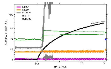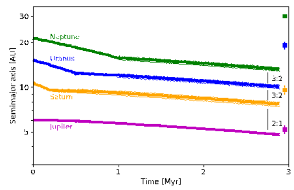 “我们的研究表明,该过程导致的动力学不稳定紧随着气体盘耗散,在太阳系诞生后约五百万到一千万年间发生。有别于Nice模型,我们的模型中巨行星轨道不稳定发生的时间更早。”刘倍贝说。