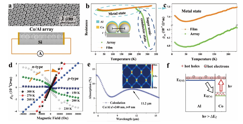 图1. 双金属阵列超低电阻率半导体 (a)样品示意图,(b)金属-超级半导体转变,(c) b低温金属区间放大图,(d)不同温度下的霍尔曲线,(e) FDTD模拟显示阵列结构在室温热红外有等离子共振光吸收, (f) 超级半导体能级示意图。