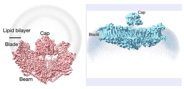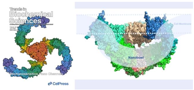图1 PIEZO通道的三聚体三叶螺旋桨状(左图,俯视图)与纳米碗状(右图,平视图)三维结构