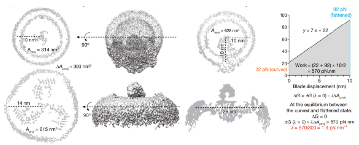 其次,PIEZO1-膜系统在展平的过程中,膜投影面积扩展了约300nm2(图7左),结合前人研究,研究者计算出从弯曲状态到平展状态的转变需要施加92pN的力,570pN·nm的做功。换算为张力,则需要1.9pN/nm(图7右),接近实验测量值1.4pN/nm。至此,研究者建立了对PIEZO1固有的曲率力学灵敏度的精确定量描述。