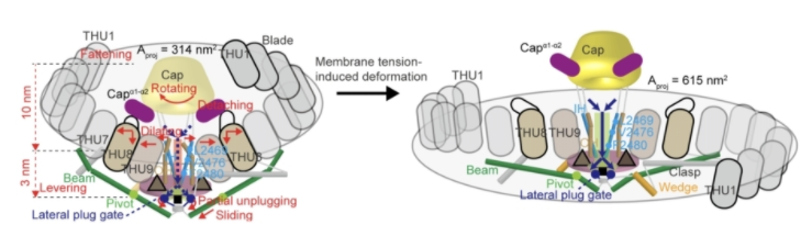 基于这种独特的结构,肖百龙团队及其他课题组进一步研究(图2),并提出猜想:当细胞膜张力改变时,PIEZO可以从弯曲变为平展状,带动中间的孔道开放,从而将机械力刺激转化为阳离子流通的电信号(图3左下)。