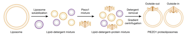 揭开谜团的难点在于,如何引入力?蛋白并不是靠“呆若木鸡”的状态来发挥功能,其结构的变化才是生命奥妙所在。但迄今为止,还未有人成功解析膜上蛋白受力变化时的结构。肖百龙与李雪明指导杨旭中、林超、陈旭东和李首卿四位博士生,对这一尖端难题发起挑战,最终首次建立了膜上受力结构解析体系(图4)。该策略的核心是把PIEZO蛋白重组到脂质体上,并利用蛋白与膜的曲率差异,产生膜张力和弯曲力。基于该技术突破,研究者们首次获得了PIEZO在膜上的弯曲结构(图5左),及受力展开的结构(图5右)。