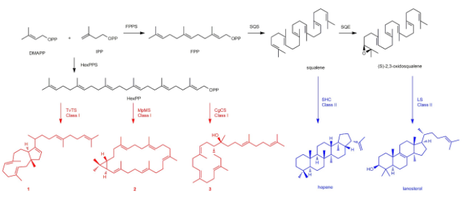 三萜化合物是具有广泛生物活性的一大类天然产物,已有两万多种被先后发现,成药四百多种,包括临床上广泛使用的众多重要的甾体激素类药物和人参皂苷等天然产物,在保障人类健康和提高生活质量方面发挥着不可替代的作用。由于两万多种该类产物已被发现,其合成机理的传统认知已经长期固化:三萜化合物始于角鲨烯合酶催化两分子法尼基焦磷酸形成角鲨烯,进一步氧化生成环氧角鲨烯,而后三萜合酶负责催化角鲨烯或环氧角鲨烯环化形成霍烯或羊毛甾醇,庞大的结构多样性则是由众多不同的修饰酶催化而成。