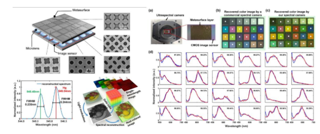 该成果研制的国际首款实时超光谱成像芯片如图1所示。通过硅基超表面实现对入射光的频谱域调制,利用CMOS图像传感器完成频谱域到电域的投影测量,再采用压缩感知算法进行光谱重建,并进一步通过超表面的大规模阵列集成实现实时光谱成像。该款实时超光谱成像芯片将单点光谱仪的尺寸缩小到百微米以下,空间分辨率超过15万光谱像素,即在0.5 cm2芯片上集成了15万个微型光谱仪,可快速获得每个像素点的光谱,工作谱宽450~750 nm,分辨率高达0.8nm。