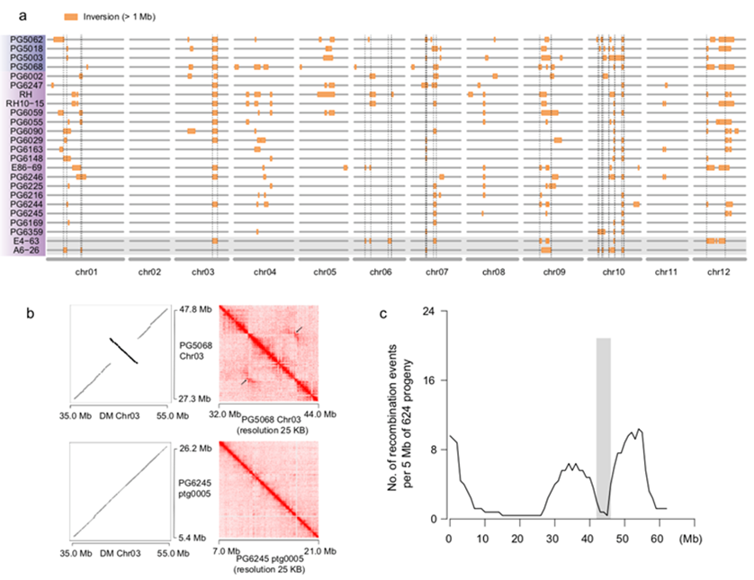 此外,研究人员鉴定出了561,433个高质量的结构变异,并且首次构建了栽培和近缘野生马铃薯的大片段倒位图谱。其中,马铃薯3号染色体5.8 Mb倒位事件与控制块茎中类胡萝卜素积累基因紧密连锁,并且在自交后代中该区域重组率显著降低,该现象为自交系的改良和去除潜在的连锁累赘提供了重要思路(图1-2)。