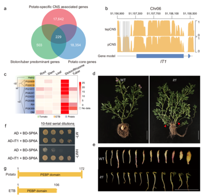 通过马铃薯、番茄和Etuberosum的多组学比较分析,研究人员鉴定到一个可能在薯块发育过程中发挥关键作用的TCP转录因子。后续Knockout实验证明,该基因在薯块发育的起始时期发挥关键作用,命名为薯块身份基因Identity of Tuber(IT1)。其突变体匍匐茎顶端无法正常膨大形成薯块,转而发育成了侧枝;IT1与结薯移动信号因子SP6A存在蛋白直接互作,不结薯种Etuberosum虽然有IT1却在SP6A上有突变。