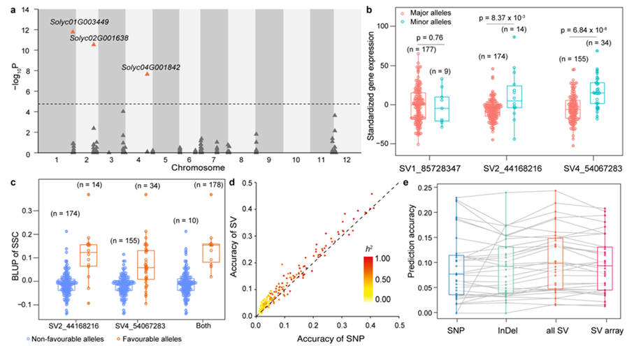 为了展示找回的遗传力在育种中的实际作用,研究人员首先对可溶性固形物含量(SSC)进行了分析,共鉴定出了2个潜在的与SSC含量高度相关的SVs,可以用于未来的分子标记辅助选择。而对影响番茄风味的33种代谢物进行分析发现,利用全部的SVs作为分子标记进行基因组选择的效果最佳。研究人员进一步精心选择出一个不超过2.1万SVs的数据集,发现如果利用该数据集设计育种芯片,GS的准确率可能超过利用全部的SNPs该研究为基于SVs设计分子标记提供了理论支撑。