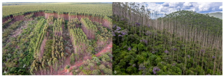 图1. 创新性的天然林恢复试点:A-巴西圣保罗州Itatinga圣保罗大学森林实验站的桉树人工林景观中,通过自然恢复、人工辅助的自然恢复、人工种植多样本土植物等方式恢复天然林生态系统;在种植有桉树的实验地,桉树在种植5年后采伐,木材收入可用于帮助承担恢复项目的成本。B-巴西圣保罗州Bertioga对桉树人工林进行改造,用药剂杀死桉树,让本地植物群落自然生长,最终恢复为本地原有的大西洋雨林。(图片来源:Paulo Molin和PedroBrancalion)