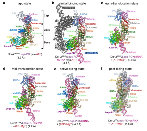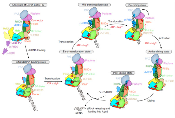 此前的研究报道了Dicer-2蛋白结合底物时就会有明显的构象变化,加之ATP依赖的Dicer-2蛋白在siRNA加工过程中需要通过水解ATP来在双链RNA上移动,并且连续的切割过程势必也会导致存在处于不同状态的复合物,三者叠加势必对复合物的均一性造成较大的影响。对此,研究团队从活性位点突变的单独蛋白复合物结构开始解析;之后加入了双链RNA,获得了无ATP时,处在初始结合状态的Dicer-2–Loqs-PD–dsRNA复合物高分辨结构;在此基础上,进一步加入ATP,通过数据收集与计算分类,得到了切割活性状态与两种明显具有不同结构特点的移位状态(早起移位与中期移位状态);然后使用正常活性的Dicer-2蛋白,获得了处于切割后状态的复合物,并通过分析发现它正向早起移位状态转变;从而将整个过程串起,阐明了Dicer-2–Loqs-PD复合物从结合双链RNA并在其上移动,到形成切割活性状态,直至切割完成产生siRNA的整个循环过程的分子机制和其中连续且递进的构象变化。