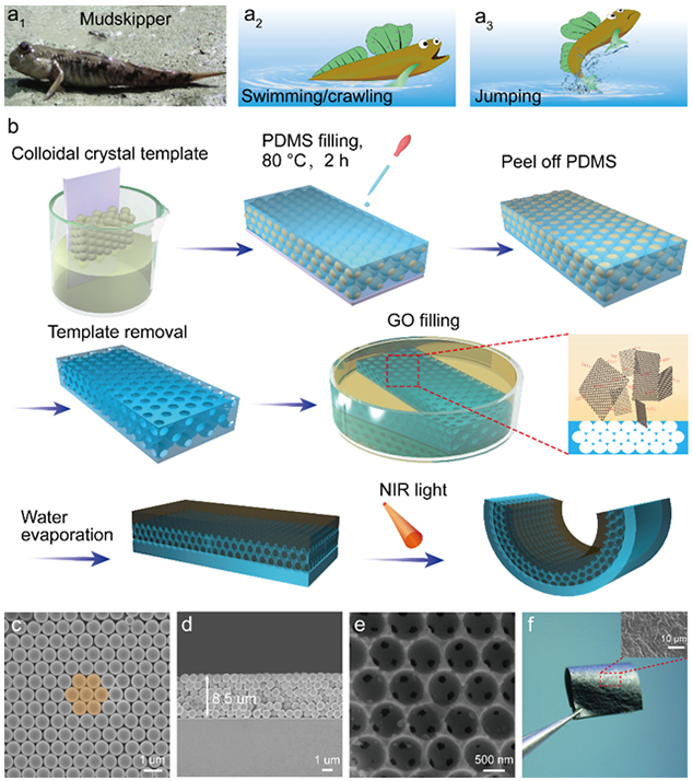图1. 仿生弹涂鱼爬行、游动、跳跃理念及光驱动薄膜的制备和表征