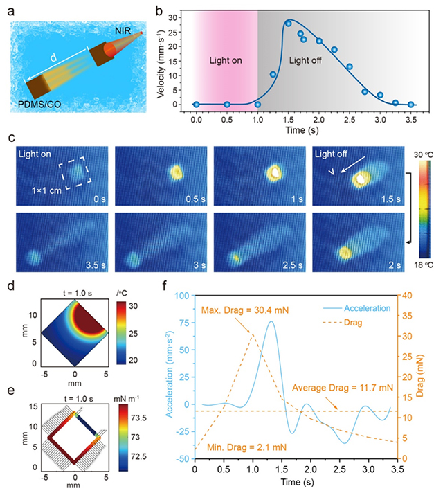 受弹涂鱼陆地爬行、液面游动和跳跃的启发,中国科学院兰州化学物理研究所固体润滑国家重点实验室周峰研究员团队开发出了一种内置多孔结构的多功能光驱动和多场景应用的仿生机器人(图1)。在光刺激下,驱动薄膜可以迅速在水面游动,这是由于受光热效应的影响薄膜周围液体表面张力变小,形成梯度张力,驱使薄膜向高表面张力区域移动,即马兰戈尼效应(图2a-c)。研究人员使用ANSYS软件建立有限元模型模拟并计算了薄膜的温度和应力场,证实了这一现象的合理性(图2d, f)。