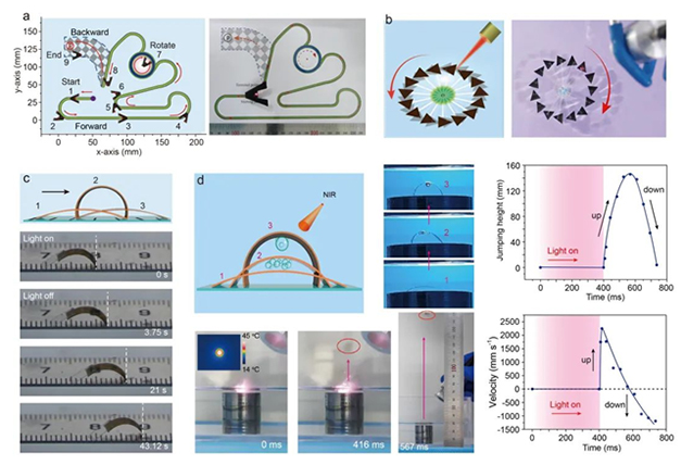 通过合理的设计和对光的有效控制,驱动薄膜可以在水面上沿预先设计的路线完成直线、转弯、旋转和后退等运动(图3a),也可以在固定光源照射下像游轮螺旋桨一样自行旋转运动(图3b),驱动薄膜还可以克服乙醇溶液的阻力,完成液下爬行(图3c)。在光刺激下,驱动器可以在极短的响应时间(400ms)内从液体介质跳跃到空气中,最高速度为2m/s,高度可达14.3cm(图3d)。