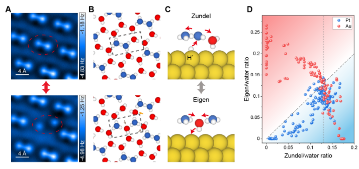 图3 (A-C)针尖操纵Eigen和Zundel构型相互转变的实验图和模型示意图;(D)不同氢离子掺杂浓度下,Au(111)与Pt(111)表面Eigen与Zundel离子浓度的关联