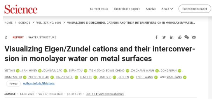 Y. Tian, J. Hong, D. Cao, S. You, Y. Song, B. Cheng, Z. Wang, D. Guan, X. Liu, Z. Zhao, X.-Z. Li, L.-M. Xu, J. Guo*, J. Chen*, E.-G. Wang* and Y. Jiang*, Visualizing Eigen/Zundel cations and their interconversion in monolayer water on metal surfaces, Science 377, 315-319 (2022). (https://www.science.org/doi/10.1126/science.abo0823)