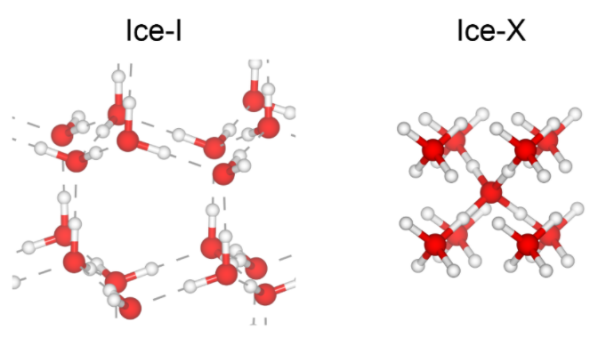 图1 冰I相与冰X相。冰I相是自然界最常见的冰相,水分子之间形成正常氢键(O-H‧‧‧O);冰X相是水分子在100多万个大气压下的对称氢键相(O-H-O),氢原子位于两个氧原子之间的几何中心位置