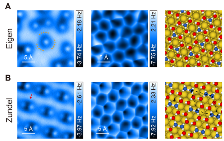图2 Au(111)表面上Eigen(A)以及Zundel(B)构型二维冰的AFM实验图(第一列水合离子图;第二列氢键网络图)和原子结构模型图(第三列)。模型图中,蓝色代表Eigen/Zundel构型离子,红色代表水分子