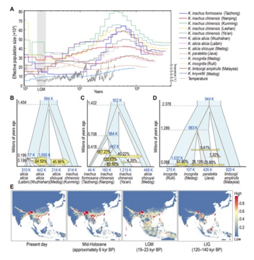 通过采集枯叶蛱蝶属的13个地理种群样本及其他蛱蝶科样本,本研究对共计21属105份蝴蝶标本进行基因组重测序,追溯了枯叶蛱蝶属的起源。系统发育、种群遗传结构及历史种群数量的分析结果表明,枯叶蛱蝶属在系统发生树上形成单系,各物种存在较为独立的遗传背景,多个种群曾随地球温度下降而出现种群数量的减少。随后的种群动态历史分析、基于最大熵模型的栖息地建模及对系统发生树进行时间矫正的结果显示,多个种群由墨脱地区迁出向东南亚的岛屿扩散,而喜马拉雅山脉东部地区在多个历史时期为枯叶蛱蝶属提供了适宜度较高的栖息地,且属内物种分化时间对应了青藏高原的隆升时间。综合以上分析结果,本研究提出,由于青藏高原隆升形成的丰富山地微环境促进了枯叶蛱蝶属物种分化,使喜马拉雅山脉东部地区成为枯叶蛱蝶属的分化中心。