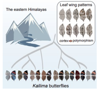2022年8月2日,北京大学生命科学学院、蛋白质与植物基因研究国家重点实验室、北大-清华生命科学联合中心张蔚课题组,以封面文章的形式在Cell杂志在线发表了题为“The evolution and diversification of oakleaf butterflies”的研究论文。研究整合多组学数据,以枯叶蛱蝶属蝴蝶为研究系统,对于其物种多样性和遗传多样性的产生机制及演化历程进行了深入探究。本研究在宏观层面解析出喜马拉雅山脉东部地区为该属蝴蝶的起源地与分化中心,青藏高原的隆升可能促进属内物种分化;同时于微观层面鉴定出控制枯叶蛱蝶翅腹面叶形拟态多态性的基因cortex,并发现其在多个物种中经历了长时间的平衡选择。该研究为理解由地理变化和自然选择驱动的演化创新提供了一个新的视角,为生物多样性的研究提供了新的理论和范式。
