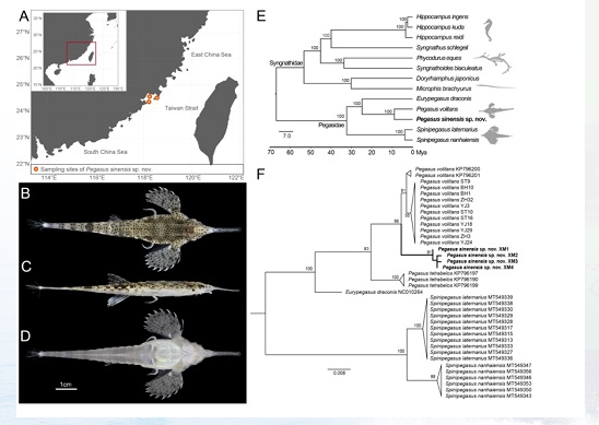 然而有关海蛾鱼分类及种群资源的研究十分匮乏,为避免其物种资源尚未被充分认知就可能面临绝灭的困境,研究人员对我国近海的海蛾鱼物种开展了系统的调查和研究。我国之前共记录有海蛾鱼3种,主要分布在福建及其以南的近岸海域,通过对样本的形态和遗传学信息的综合分析,研究团队在厦门、阳江和北海海域确认2个新的海蛾鱼物种。其中,中华海蛾鱼(Pegasus sinensis sp. nov.)模式产地为福建厦门近海,其原本一直被认为是飞海蛾鱼(Pegasus volitans);南海海蛾鱼(Spinipegasus nanhaiensis sp.nov.)模式产地为广东阳江近海,其长期以来被认作短尾海蛾鱼(Spinipegasus laternarius)。新增的2个海蛾鱼新种正模及副模标本目前保藏在中国科学院南海海洋生物标本馆,全球海蛾鱼科鱼类自此从6种增加至8种,其中我国近海共分布有5种。