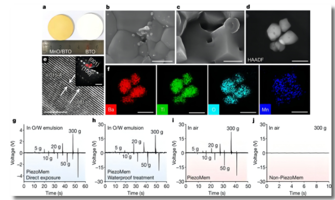 图1 锰掺杂钛酸钡基PiezoMem形貌(a-d)与相应压电输出(g-j)