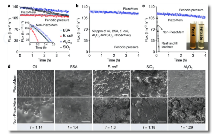 图3 PiezoMem普适性抗膜污染特性(a-c)和膜污染后的膜表面电镜图(d)