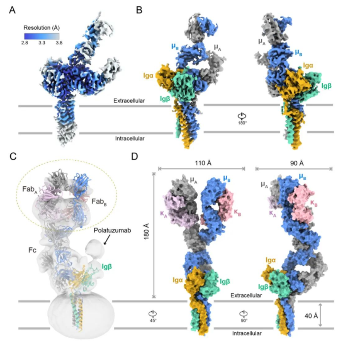 BCR根据mIg类型的不同,可以分为五种类型,即IgM、IgD、IgG、IgA和IgE。此次施一公团队的研究对象,正是其中的IgM型。实验过程中,他们首先将IgM-BCR的四个组分的cDNA进行密码子优化并克隆到表达载体上,接着通过共表达内质网潴留蛋白pERp1促进IgM二硫键的形成,帮助其正确折叠。之后,在蛋白纯化时加入抗体偶联药物Polatuzumab的Fab片段,最后通过冷冻电镜解析了第一个人源IgM同种型B细胞受体复合物3.3 埃(1埃等于0.1纳米)的高分辨率结构(图1)。
