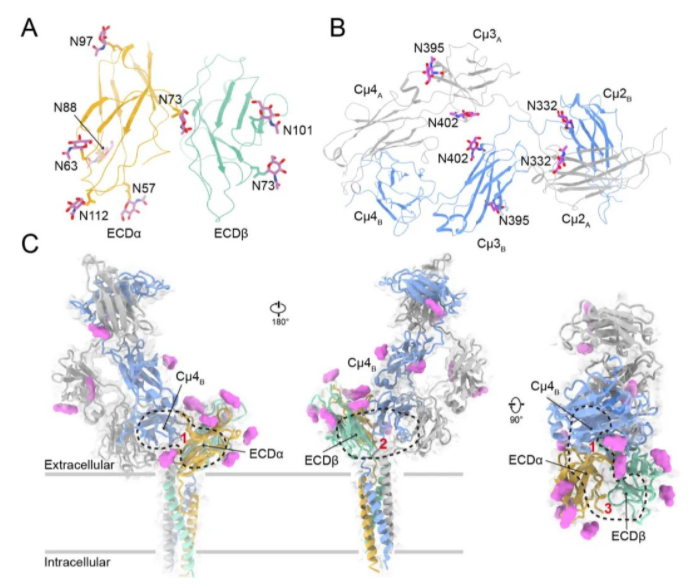 除此之外,该结构揭示了胞外域上的 14 个糖基化位点,并发现三个潜在的表面抗体结合位点,可能有助于用于疾病干预的治疗性抗体或微型蛋白质的理性设计(图3)。和已经批准的抗体偶联药物Polatuzumab vedotin一样,这些特异性结合IgM-BCR的抗体或微型蛋白质,具有治疗B细胞淋巴瘤的潜力。